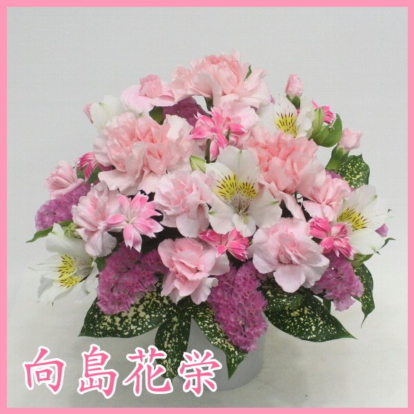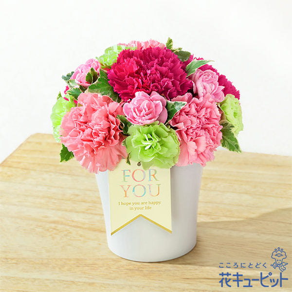 少し背丈がある樹脂ポットに挿したピンク系の可愛い感じの母の日アレンジメント