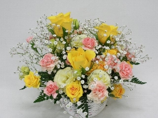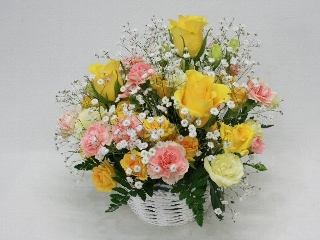 黄色いバラとカスミ草でふんわりした感じのかわいいアレンジ