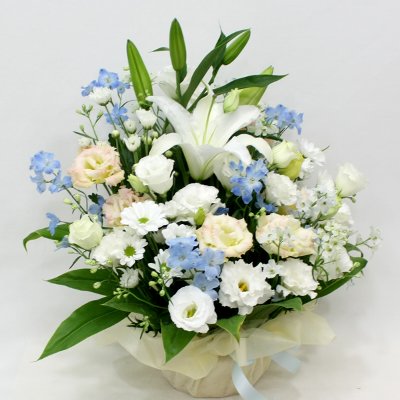 花材:メイン ユリ・トルコキキョウ その他 デルフィニューム・スプレー菊